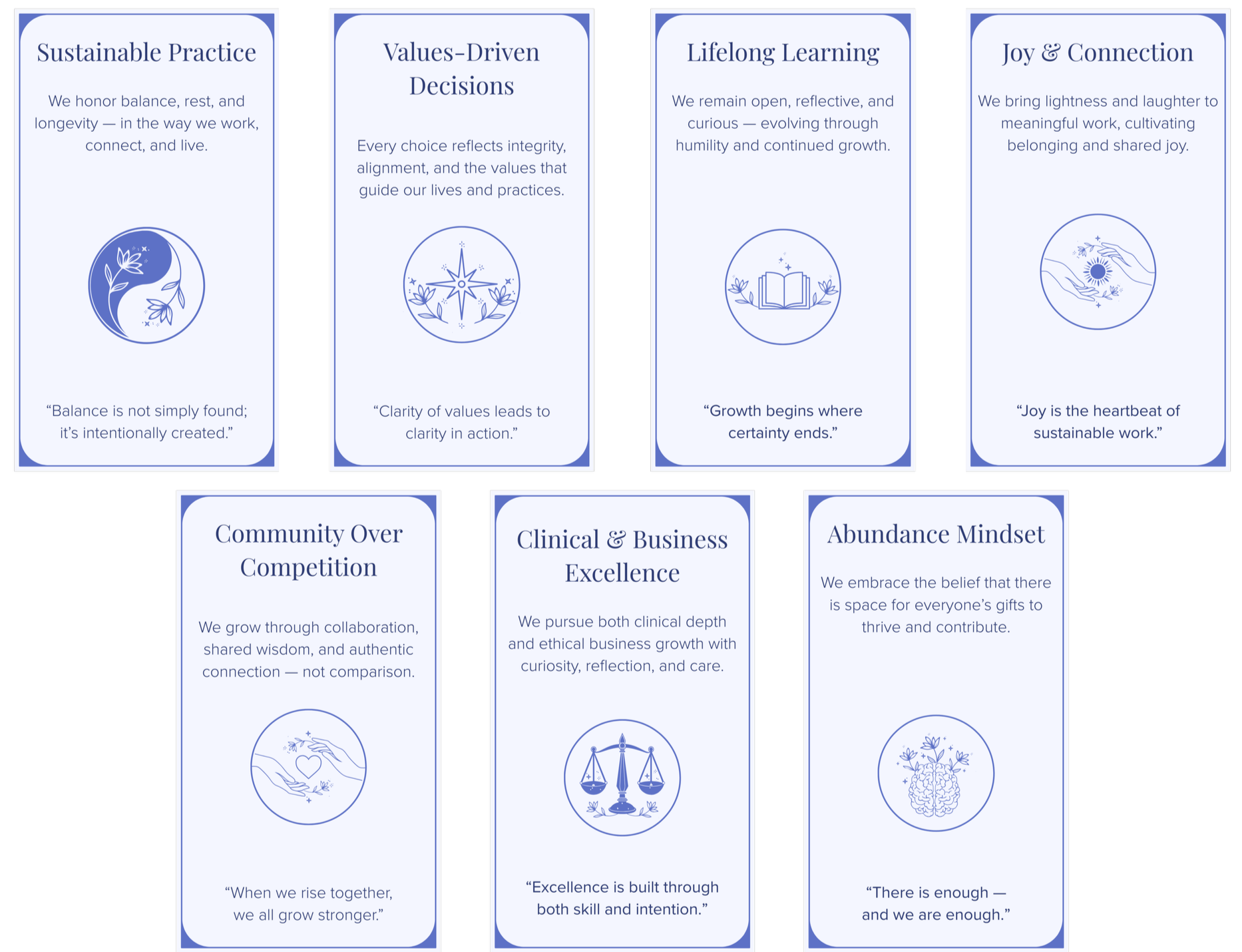 As we brainstormed her values-aligned service offerings — book clubs, workshops, continuing education events, mindfulness meetups — the pieces of our collective puzzle began taking shape. Not because we had a master plan, but because we were both asking the same question: What work feels rewarding and would actually support clinicians and clients?